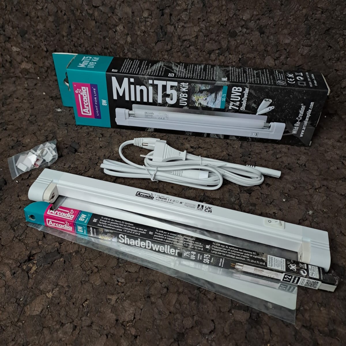 Este kit, fácil de instalar, se entrega completo con electrónica sin parpadeo, un reflector plano especialmente diseñado, kit de montaje, cable de alimentación, interruptor, cable de enlace y la lámpara ShadeDweller™ de 7 % UV-B y 8 W.