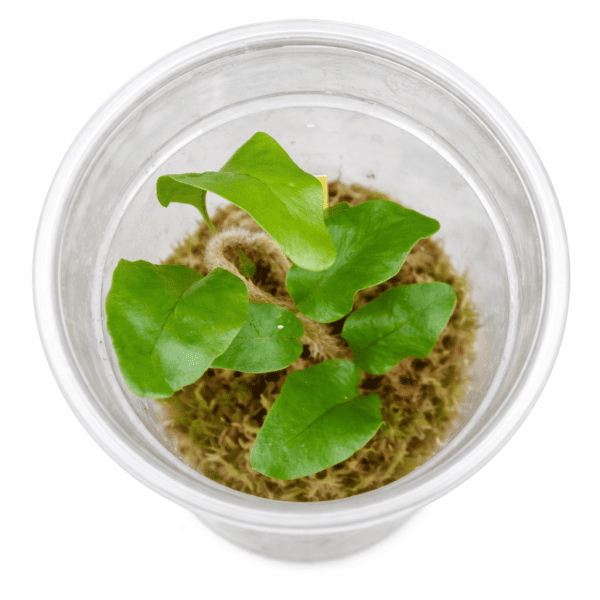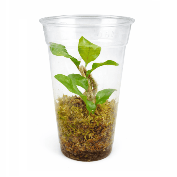 💡 Consejo de arranque: Se vende en vaso plástico con musgo esfagno. Al trasplantarlo al terrario, mantén el rizoma en contacto directo con el sustrato o el musgo sin enterrarlo completamente. La alta humedad ambiental es clave durante la aclimatación.