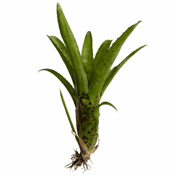 La Neoregelia anteia es una bromelia epifita de roseta compacta y carácter inconfundible: hojas verdes brillantes con márgenes ligeramente dentados y unas manchas oscuras en la base que le dan ese aspecto de planta silvestre, recién sacada de la selva. Su porte contenido y su estructura abierta en estrella la hacen ideal para composiciones de terrario tropical donde necesitas volumen sin que la planta lo ocupe todo.