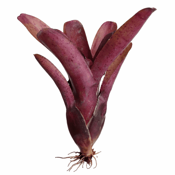 La Neoregelia fireball spotted es una bromelia epifita que cumple exactamente lo que promete su nombre: una roseta encendida en rojo-magenta intenso, con hojas anchas y arqueadas salpicadas de pequeñas manchas oscuras que añaden profundidad y textura a un color ya de por sí arrollador. Si la felix es roja, la fireball spotted es fuego. Una pieza de impacto máximo para cualquier terrario tropical que necesite un punto de color real y contundente.