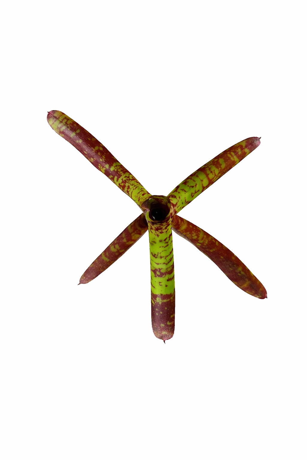 La Neoregelia guacamole es una bromelia epifita de personalidad propia: hojas largas, estrechas y muy abiertas en verde lima brillante con bandas y manchas irregulares en burdeos oscuro que crean un patrón casi de camuflaje, completamente orgánico y salvaje. Su porte dinámico y abierto le da un aspecto distinto al de las bromelias de roseta compacta, aportando movimiento y naturalidad a cualquier composición de terrario tropical.