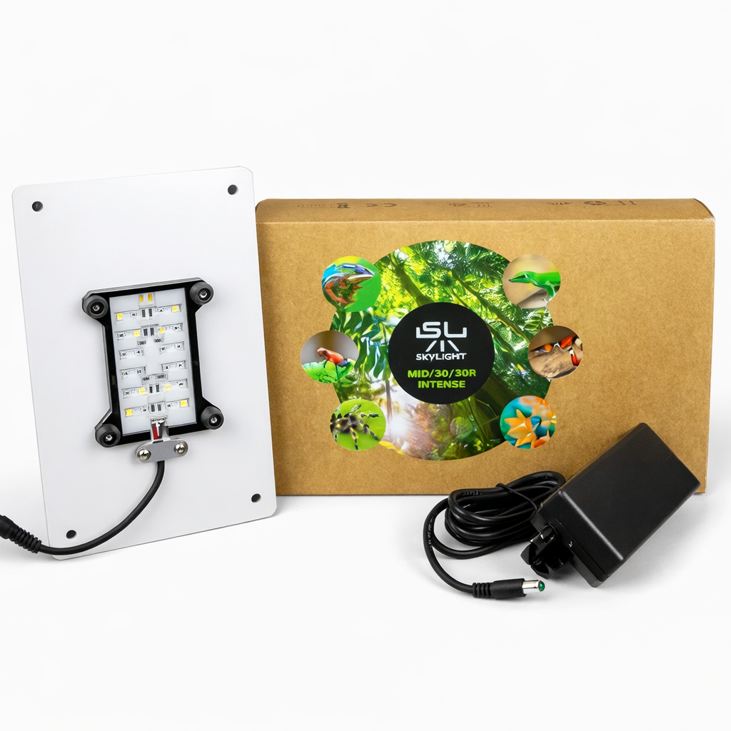 La diferencia clave frente a la Skylight MID-30 Intense está en su estructura exterior: la serie MID-30R es más compacta, lo que facilita su uso en iluminación de racks y también para atornillar sobre baterías de terrarios. Si montas varias urnas o trabajas con instalaciones modulares, esta forma compacta te hace el montaje más cómodo y limpio.